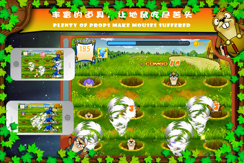 在电玩城里的打地鼠游戏中,玩家需要一个箩卜一个坑,一只地鼠一棒槌地打,但是在《地鼠大作战》中玩家可以像《水果忍者》那样随意地切割地鼠,这不但提高了"工作效率",乐趣也更高了,而且更加地考验玩家的技巧。另外,通过获取更多的连击数,玩家还能得到事半功倍的各种道具,让原本单一的玩法变得更为丰富了。